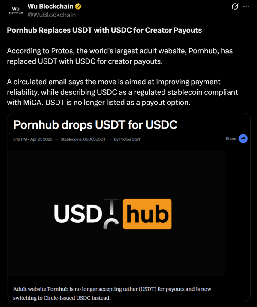 The change first surfaced through a creator email shared on April 21, and it didn’t try to dress things up. Pornhub made it clear that USDC is now the preferred payout option, describing it as fully backed, regulated, and aligned with MiCA standards, which is becoming a big deal in Europe.