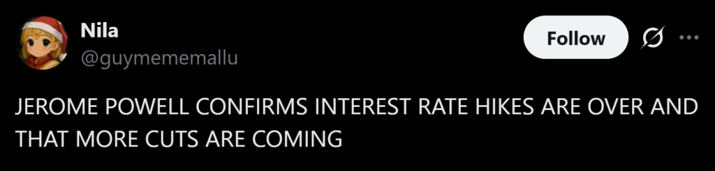 Taken together, Powell’s comments indicate the Fed believes its tightening work is mostly done. The internal debate now centers on timing and degree, not direction. Unless incoming data changes sharply, rate hikes appear firmly off the table. For markets, borrowers, and risk assets, that shift introduces a calmer and more predictable backdrop for monetary policy moving forward.