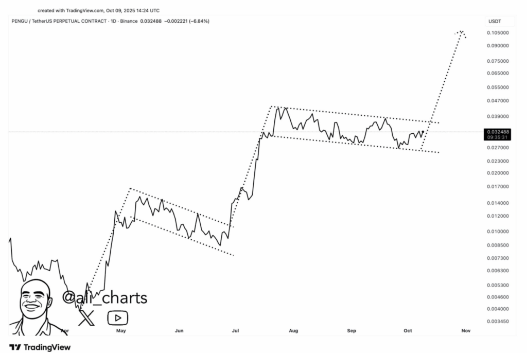 According to analyst Ali, PENGU might be carving out another bullish flag pattern — the same type that’s historically preceded massive rallies for the token. The daily chart shows this familiar rhythm: strong runs followed by periods of steady cooling off, then another leg higher once consolidation ends.