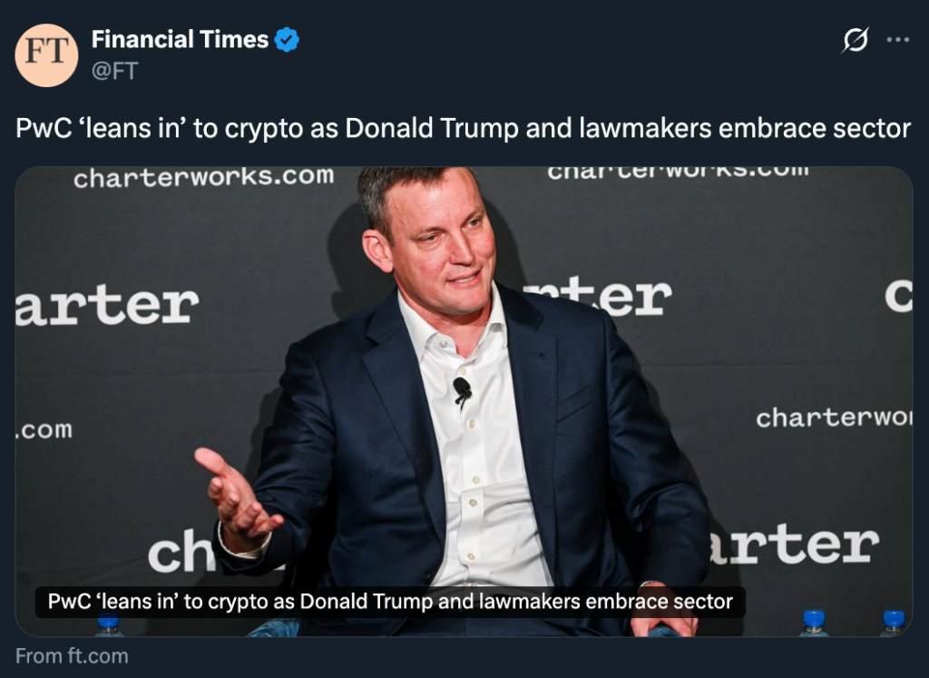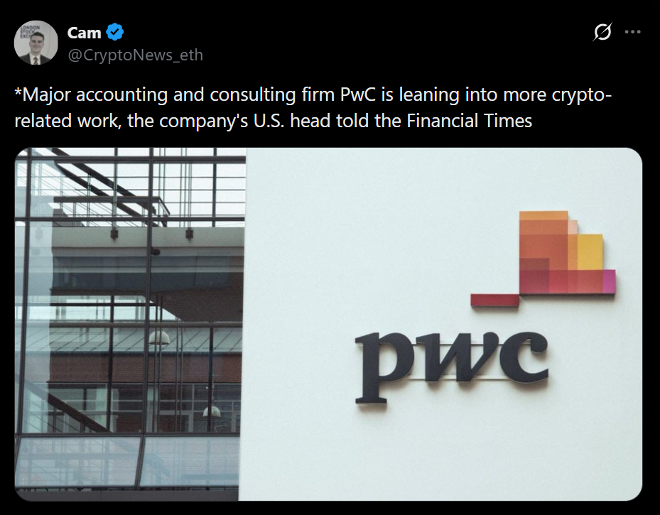 PwC leaning further into crypto is not headline-grabbing in the usual way, but it may be one of the more important signals we have seen in a while. For years, large accounting firms stayed cautious, offering narrow crypto-related services while keeping real exposure limited. That hesitation now appears to be fading, and PwC’s recent comments suggest internal confidence is finally catching up with client demand.
