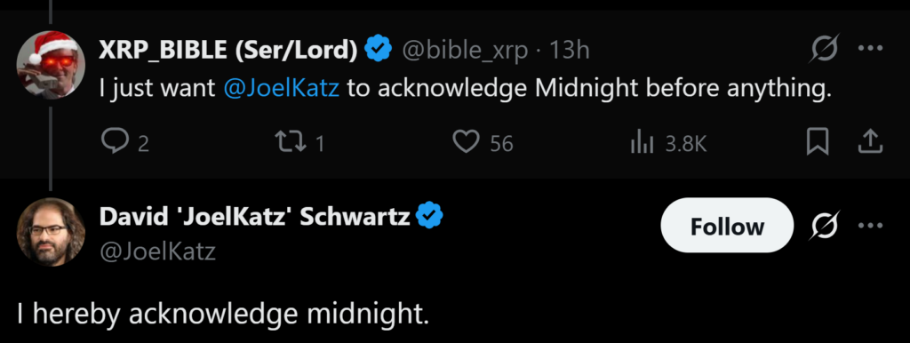 - Ripple CTO David Schwartz acknowledged Cardano’s privacy-focused Midnight project.