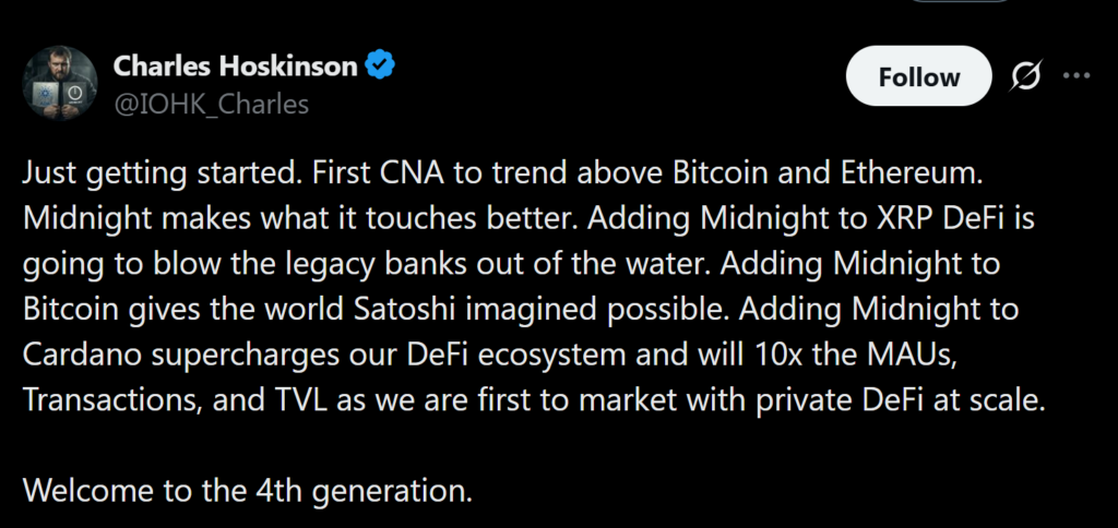 Hoskinson addressed the relationship directly in a Dec. 27 post on X, arguing that Midnight’s zero-knowledge proof architecture could enhance the XRP Ledger rather than compete with it. XRP, he noted, excels at transparent, fast settlement, while Midnight introduces a privacy layer that still respects compliance boundaries. When combined, the two could enable privacy-preserving DeFi built for institutions, potentially positioning XRP as a serious alternative to traditional banking rails. Hoskinson also hinted that Cardano and even Bitcoin could benefit from similar integrations.