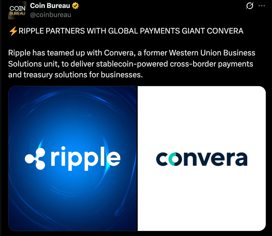Ripple’s latest move with Convera might look like another partnership headline, but the implications run deeper. Convera processes over $190 billion annually, so this isn’t a small-scale test. It’s real payment infrastructure meeting crypto rails at scale.