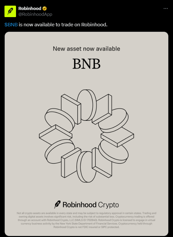 - Robinhood lists BNB, granting 27M users access to Binance’s flagship token.