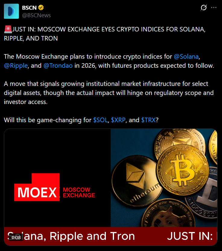 - Moscow Exchange plans new crypto indices tied to Solana, XRP, and TRON in 2026