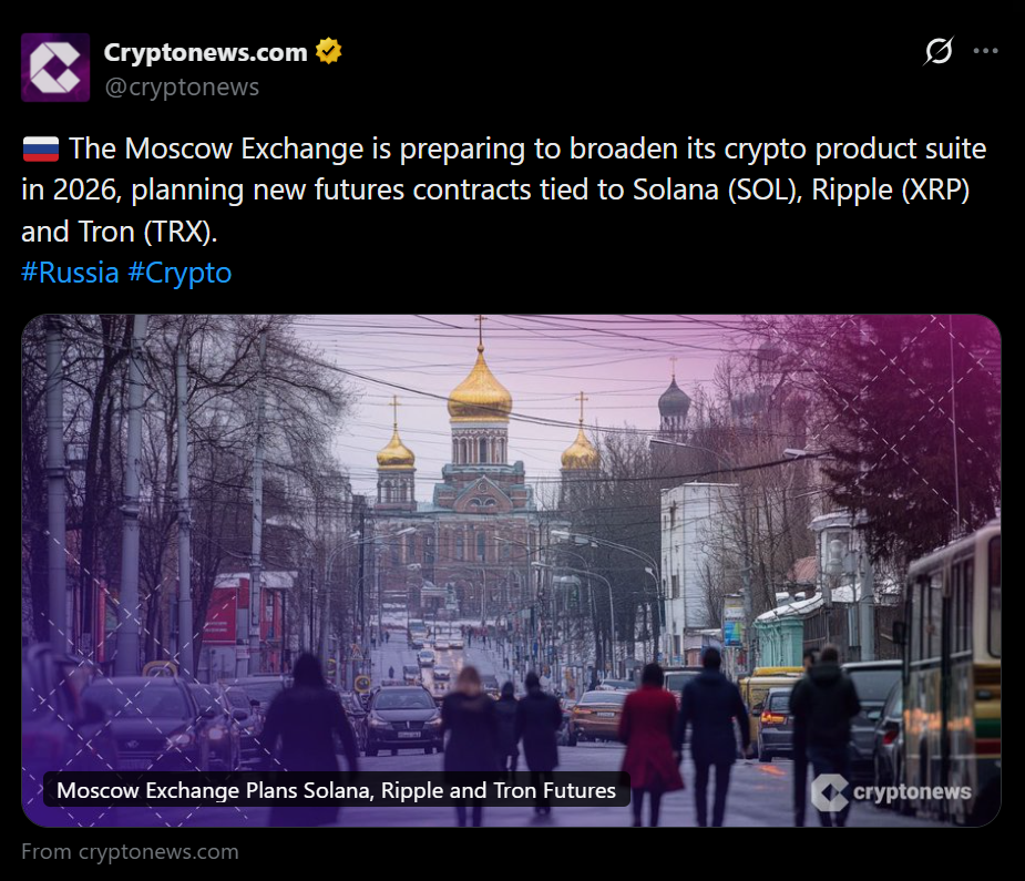 MOEX’s decision to add Solana, XRP, and TRON marks a clear shift in how Russia’s largest exchange views crypto markets. While access will stay limited and tightly regulated, the expansion signals growing institutional demand for diversified crypto exposure. As new rules come into force, Russia’s derivatives market may become a more active venue for crypto-linked trading, even as spot usage remains constrained.