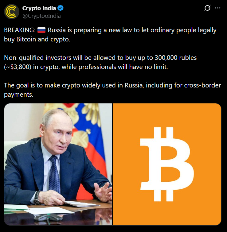 After years of hesitation and mixed messaging, Russia appears to be taking a meaningful step toward letting ordinary citizens legally own cryptocurrency. Regulators from the Central Bank of Russia and the Finance Ministry are drafting rules that would, for the first time, allow non-qualified investors to buy Bitcoin and other digital assets through licensed intermediaries. The catch is a yearly cap of 300,000 rubles and a basic risk or knowledge test, but even with those limits, the shift is notable.