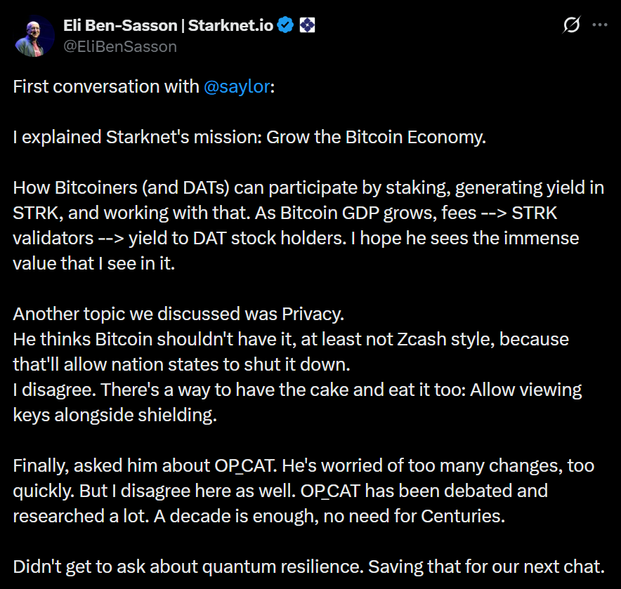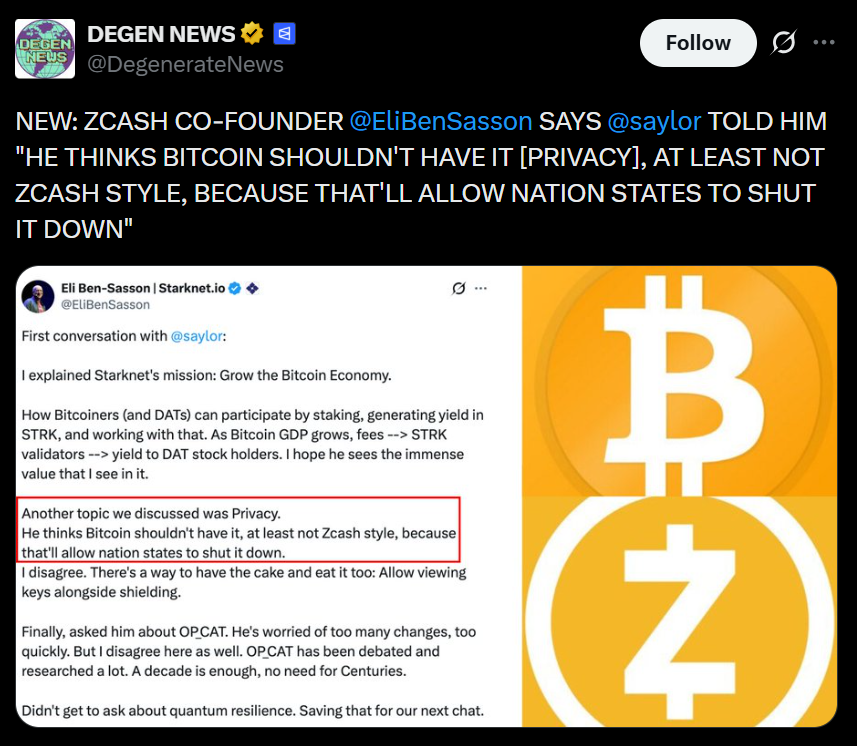 Zcash co-founder Eli Ben-Sasson recently shared details from a discussion with Michael Saylor, and the message was blunt: Saylor believes Bitcoin should not adopt Zcash-style privacy features. According to Ben-Sasson, Saylor warned that heavy privacy layers could hand governments a perfect excuse to crack down on Bitcoin, possibly even attempt to shut the network down outright. The exchange highlights just how tricky the “privacy vs. regulation” line has become for major voices in the space.