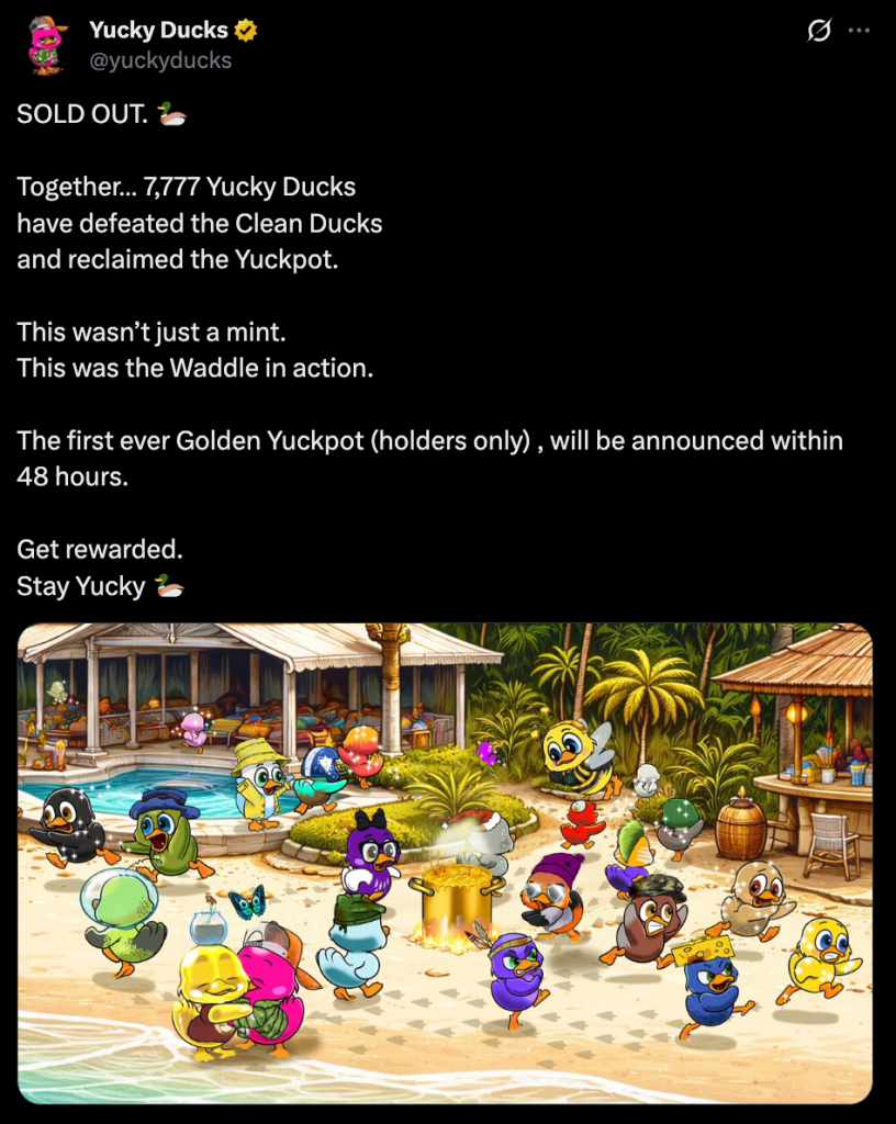 Selling out an NFT collection today isn’t about flashy launches or quick flips. It’s about giving people a reason to care after the mint, something many projects still haven’t figured out. Yucky Ducks seems to understand that, maybe better than most right now.