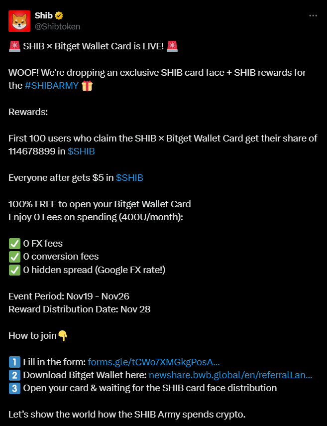 To build momentum, the team rolled out a launch promotion tied to the sign-up phase. According to the announcement, the first 100 users to claim a SHIB × Bitget Wallet Card will split 114,678,899 SHIB, while every user after that receives $5 worth of SHIB.