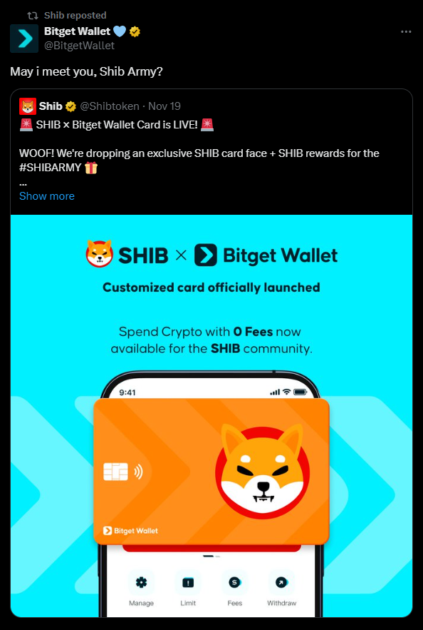 - Shiba Inu’s teased surprise is the launch of the SHIB × Bitget Wallet payment card.