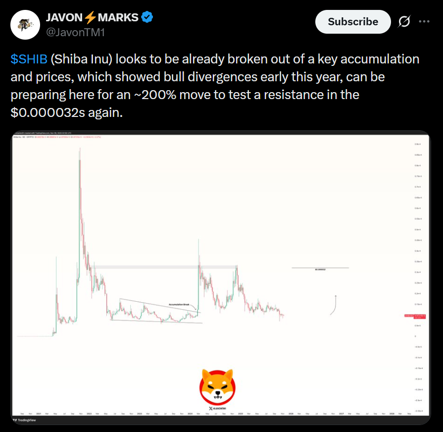 Analyst Javon Marks has been even more bullish. He noted that SHIB has broken above what he considers a key accumulation zone, backed by bullish divergences that first appeared earlier this year. In his outlook, SHIB could be gearing up for a 200% upside move, potentially retesting the $0.000032 level if momentum continues to build.