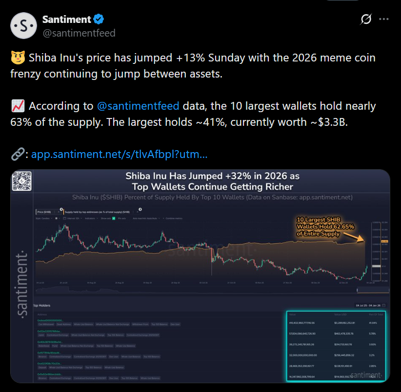On-chain data points to whales playing a central role in SHIB’s resurgence. Recent analytics highlighted by Santiment show that the ten largest wallets now control nearly 63% of the total SHIB supply, with the largest single wallet holding roughly 41%, valued at around $3.3 billion. That level of concentration often precedes sharp moves, as large holders tend to position early before broader participation returns. SHIB’s recent surge has pushed it back into the mainstream conversation after months of relative neglect.