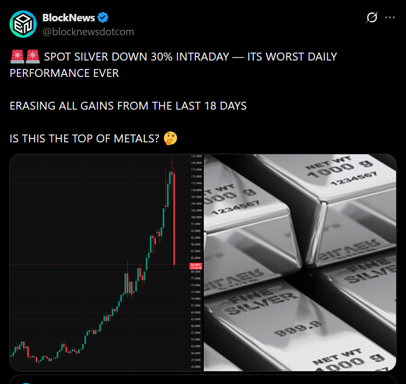 - Silver suffered its largest intraday collapse on record after a parabolic rally