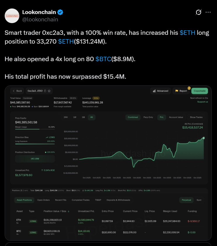 Ethereum (ETH) surged back toward the $4,000 mark on Friday as on-chain analysts tracked a “smart trader” who increased their long position to 33,270 ETH — worth about $131 million. The move reignited optimism among traders that ETH could break out of its multi-week consolidation zone.