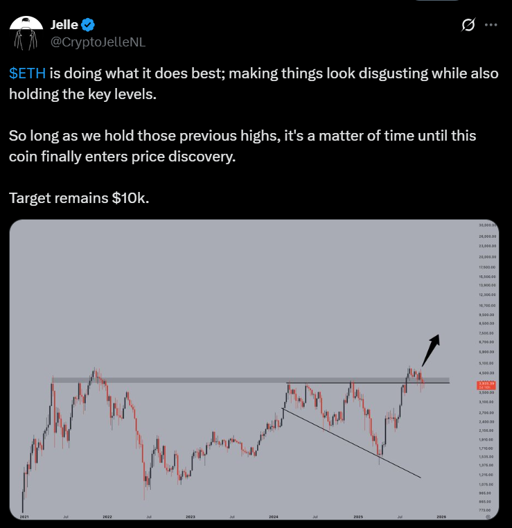 Meanwhile, Crypto Zee projects a gradual climb through $4,250 resistance, targeting a $4,750 demand zone, while Jelle reiterated that ETH remains on track toward a potential $10,000 cycle high if it maintains support above previous highs.