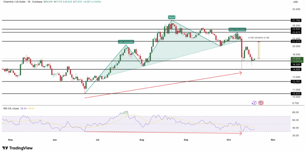 From a technical perspective, LINK broke below a head-and-shoulders pattern earlier this month, with the neckline at $21, leading to a sharp correction toward $14. Since then, it’s found support at $16, which now acts as the base for a potential rebound.