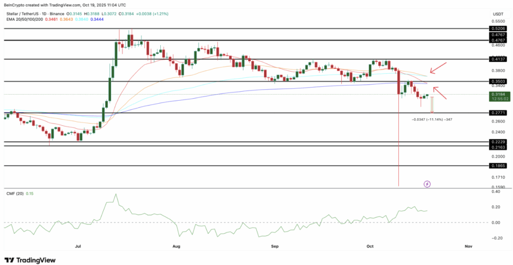 However, technical signals are turning tense. The 20-day EMA is about to cross below the 200-day EMA, and the 50-day EMA is closing in on a cross beneath the 100-day EMA — both known as death crosses, which often point to growing bearish momentum. If those crossovers confirm, XLM could drop toward $0.27, with deeper supports near $0.22–$0.18.
