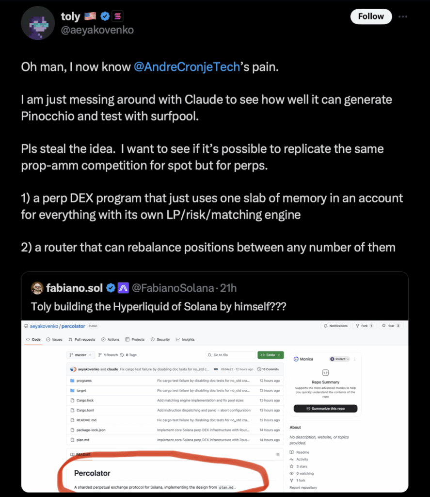 - Solana co-founder Anatoly Yakovenko released a prototype DEX called Percolator and encouraged developers to “steal” the idea.