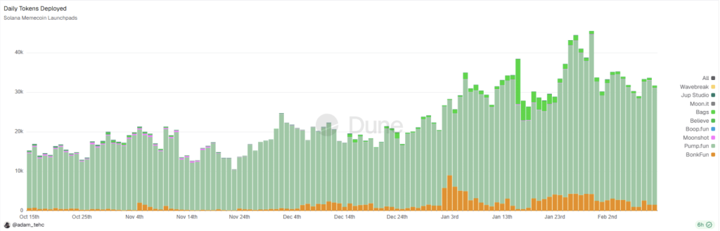While SOL itself has been struggling, the Solana memecoin machine has been doing what it always does: printing chaos at scale. Memecoin launchpads processed nearly $100 million in daily volume, and Dune data shows new token launches averaging around 30,000 per day this week. That number is so high it almost stops sounding real after you repeat it twice.