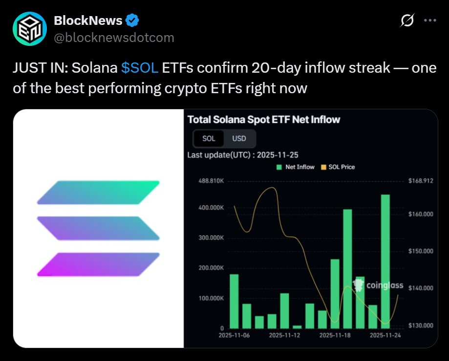 Solana just hit a huge milestone in the ETF arena. U.S. spot Solana ETFs have now logged 20 consecutive days of net inflows, marking one of the strongest early adoption streaks for any crypto ETF outside Bitcoin and Ethereum. Since launching in late October, these funds have consistently attracted capital even as broader market sentiment remained shaky.