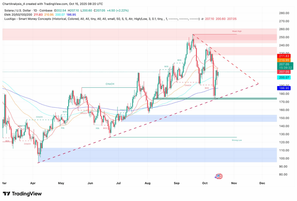 Technically, Solana’s chart looks like it’s tightening up for something big. The token’s recovery from $180 — which aligned neatly with the 200-day EMA — signaled strong demand right where it needed it. Since then, SOL’s climbed over the 100-day EMA and now faces resistance near $211. If it can close above $212, that might open the door to a run toward $230, and even back to the $250–$260 range where sellers usually show up.