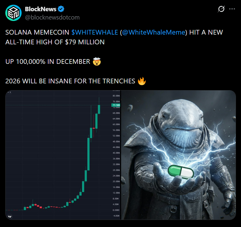 - WHITEWHALE has surged massively, pulling attention back to Solana memecoins