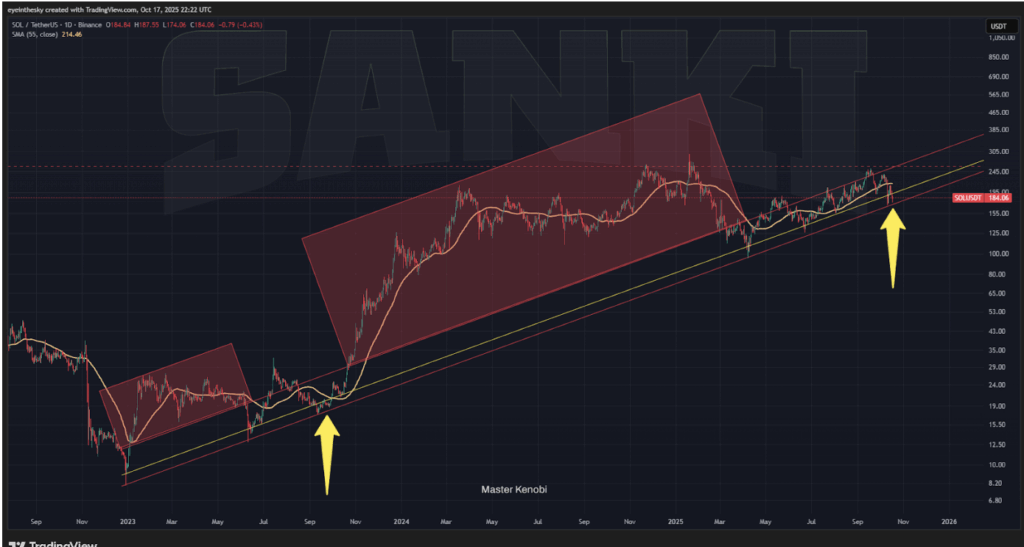 Market watcher Master Kenobi pointed out that Solana has now touched this baseline six different times since 2023, and every single touch so far has marked a solid accumulation zone — moments when the price stabilizes before switching direction. Whether history repeats itself again… that’s what traders are watching closely.