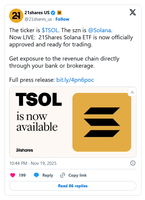 Solana had a shaky day, dropping about 4% to the $134 zone on Nov. 19 just as 21Shares rolled out its brand-new SOL ETF (TSOL) on the CBOE. Kinda odd timing — a fresh ETF launch usually brings some buzz, but broader market turbulence dragged prices down anyway. The listing puts 21Shares alongside names like Fidelity, Bitwise, Grayscale, and VanEck, all of which have been stacking Solana products since ETF approval landed. According to the firm, investors can grab TSOL through their usual banks or brokers, making regulated SOL exposure even easier to access.