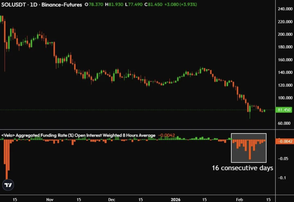 Futures funding rates for Solana remained negative for 16 consecutive days, based on an aggregated open interest weighted eight hour average shown on a Binance Futures daily chart dated Feb. 15. The reading hovered near minus 0.0042, meaning short traders were effectively paying longs to keep their positions open. Meanwhile, SOL traded around $81, still digesting a multi week slide that kicked off toward the end of 2025 and never really found solid footing.