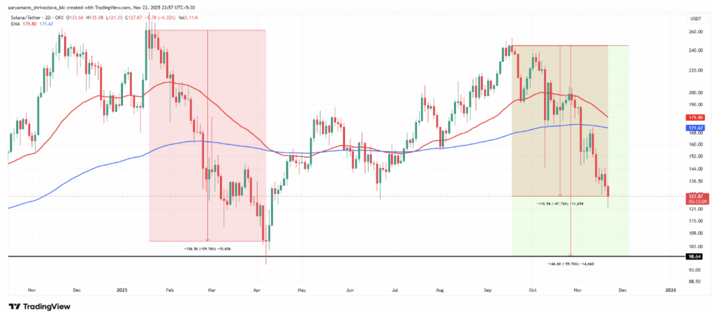Investors are hurting. Solana’s exponential moving averages are beginning to hint at a potential Death Cross, which forms when a short-term EMA dips below a longer-term one. It’s usually a warning sign of a prolonged downtrend, and Solana has seen similar setups earlier this year.