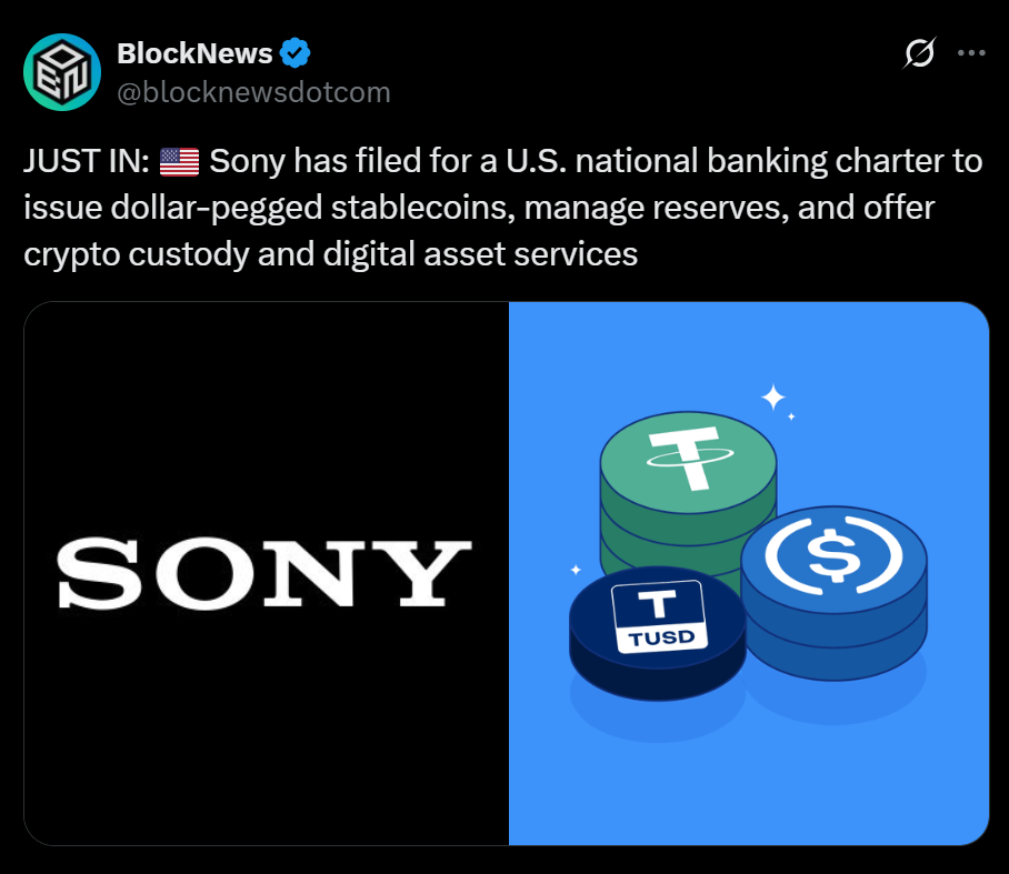 Sony is officially stepping into the world of crypto banking. The Japanese tech giant’s financial arm, Sony Bank, has filed for a national banking charter in the United States through its subsidiary Connectia Trust, with plans to issue U.S. dollar–pegged stablecoins, maintain reserves, and provide digital asset custody and management services.