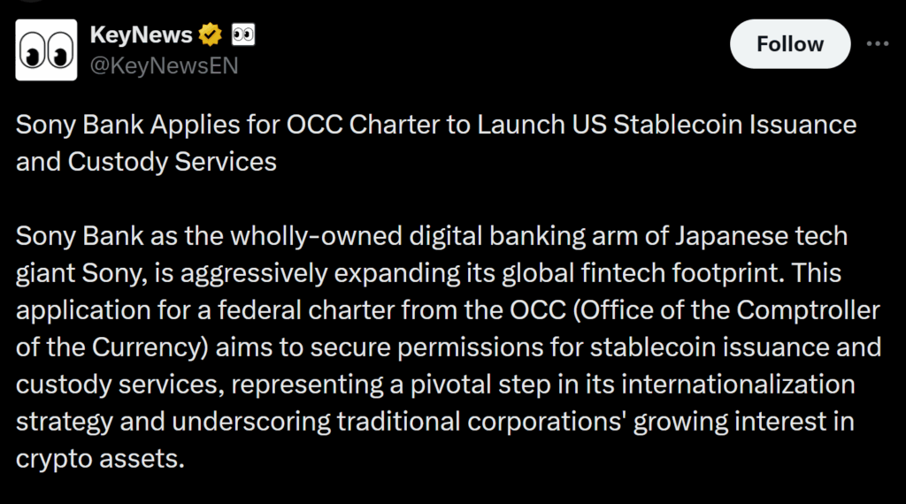 If approved, Sony would join an elite list of companies pursuing federal charters for crypto banking — including Stripe, Coinbase, Paxos, and Circle. So far, only Anchorage Digital Bank has received full approval, though it briefly faced regulatory challenges before the OCC lifted restrictions earlier this year.