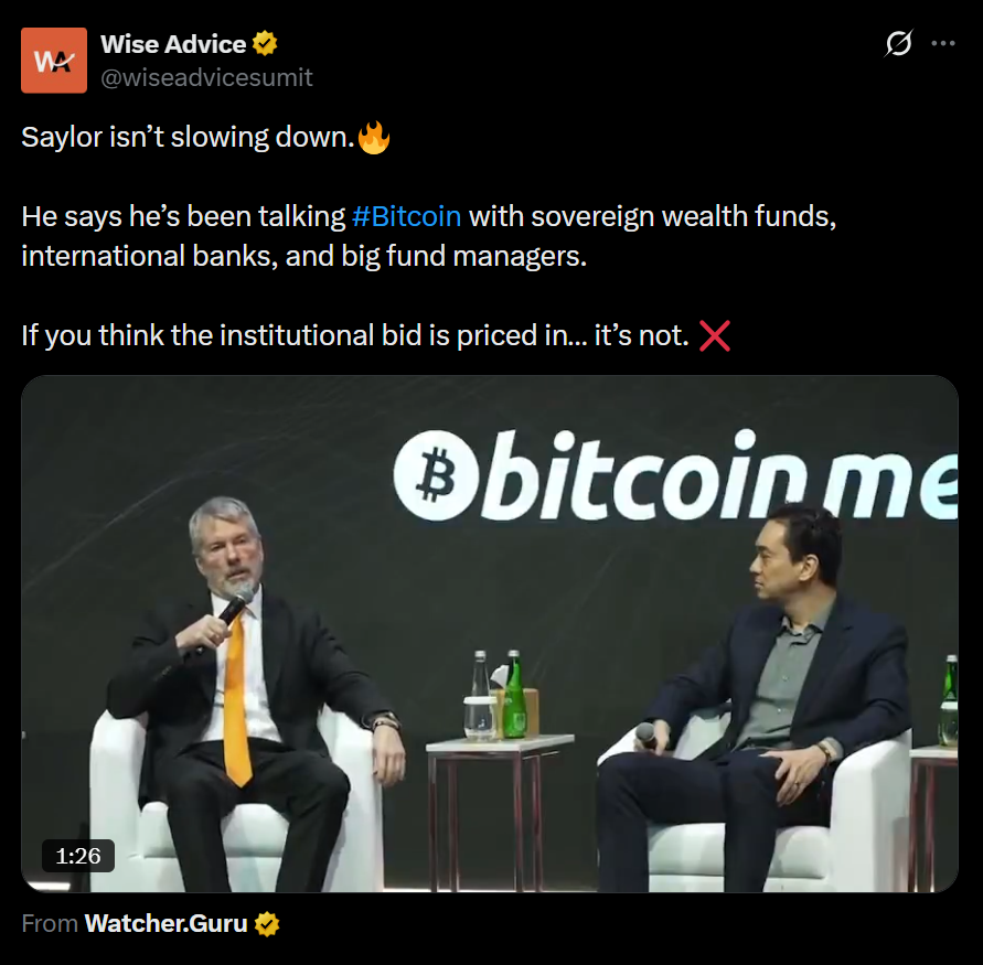• Saylor is meeting sovereign wealth funds in Saudi Arabia, UAE, Qatar, and Kuwait to promote Bitcoin as a strategic reserve asset.