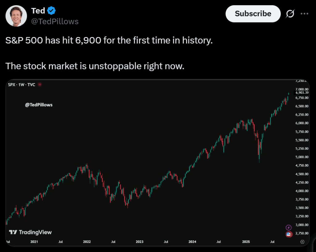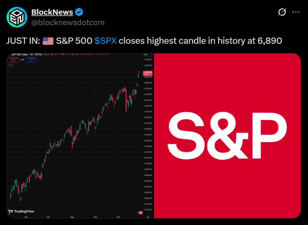 U.S. stock markets soared to fresh highs on Tuesday, with the S&P 500 climbing 0.23% to close at 6,890.89, briefly topping the 6,900 level for the first time intraday. The Nasdaq Composite surged 0.8% to 23,827.49, while the Dow Jones Industrial Average gained 161.78 points to settle at 47,706.37. All three major indexes — along with the small-cap Russell 2000 — hit new all-time highs, continuing an impressive streak fueled by artificial intelligence optimism and upbeat earnings.