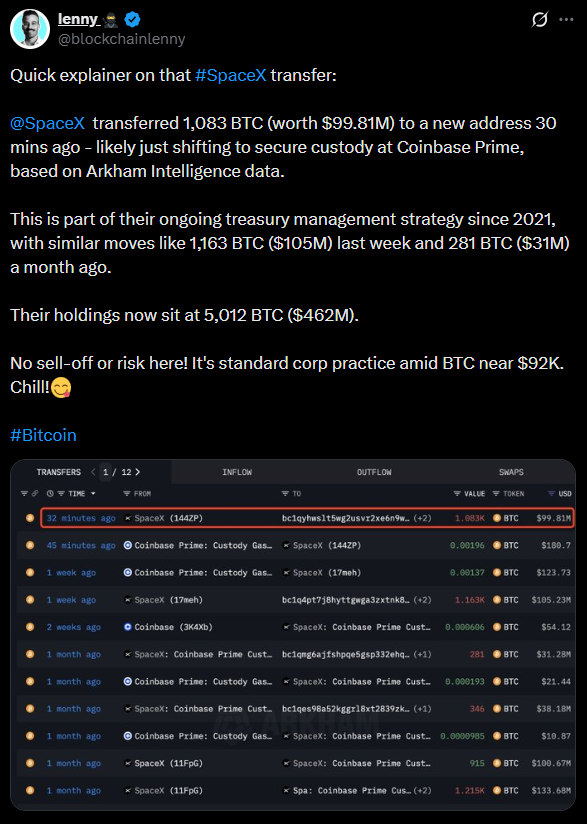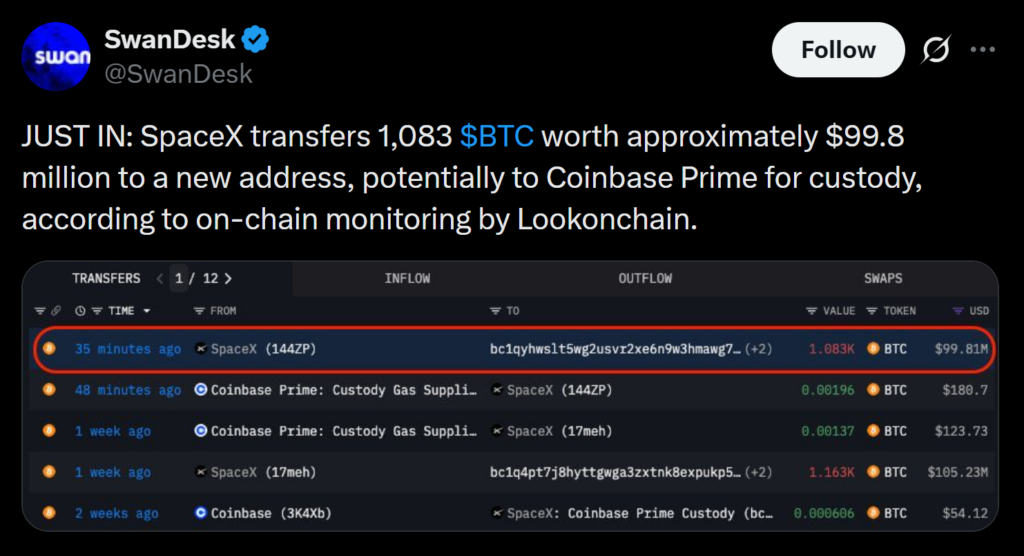 - SpaceX moved 1,083 BTC (about $100M) as part of ongoing custody adjustments.