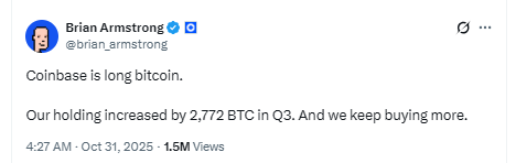 The campaign arrives amid a surge in corporate Bitcoin interest. Coinbase just added 2,772 BTC to its reserves in Q3, signaling continued accumulation from major players. Meanwhile, Prenetics revealed another 100 BTC purchase, pushing its total holdings to 378. Even Strategy, led by Michael Saylor, reported $3.9 billion in income and $20 billion in unrealized BTC gains—showing that institutional conviction hasn’t cooled.