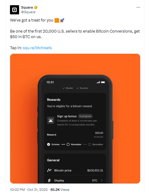 Jack Dorsey’s Square just gave the crypto world a treat this Halloween. The company announced that the first 20,000 U.S. sellers to enable its new “Bitcoin Conversations” feature will each get $50 in Bitcoin. It’s part of a campaign to make crypto talk as common as small talk—especially for merchants who might be new to the space. The initiative aims to get more people using and understanding BTC, not just holding it.