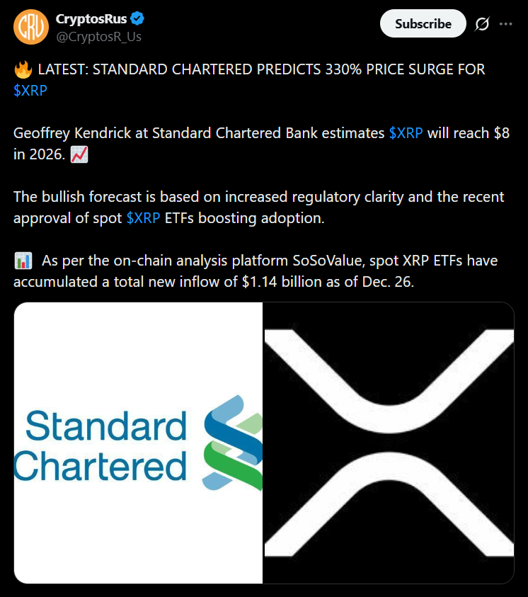 - Standard Chartered predicts XRP could surge up to 330%, targeting $8 in 2026.