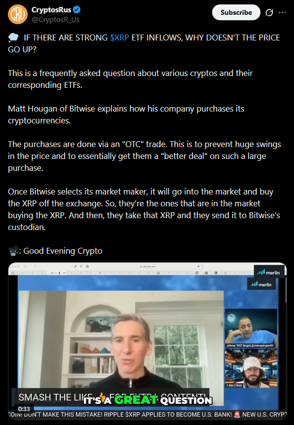 Once a market maker sources XRP through OTC channels, those tokens are then delivered to the ETF’s custodian. The result is steady accumulation without the kind of explosive price action retail traders often expect. Over time, however, sustained demand can still tighten supply and influence price discovery.