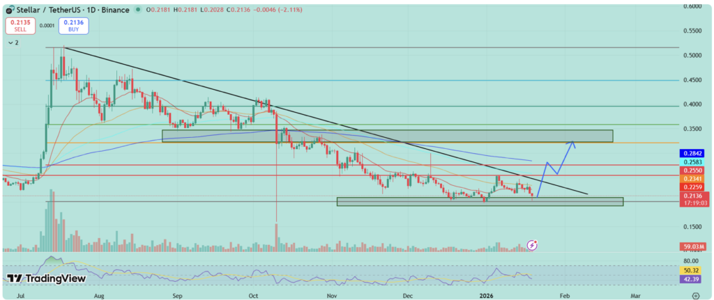 On the upside, the $0.25–$0.26 range stands out as the first area where price could gain traction. A clean move through that zone would bring $0.30 back into focus fairly quickly. Beyond that, the structure opens toward the $0.30–$0.35 region, where prior supply is clustered. As long as XLM holds above $0.20, the setup favors resolution higher over another clean breakdown.