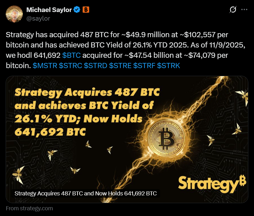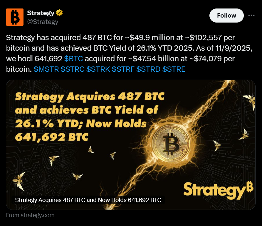 - Strategy (MSTR) bought 487 BTC for $49.9M, bringing total holdings to about 641,692 bitcoin worth over $68B.