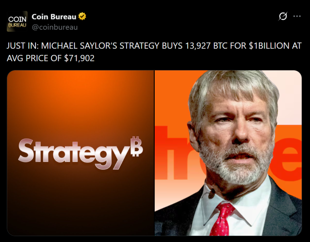 Strategy just added another massive chunk of Bitcoin, and this time the focus is pretty clear, accumulation at scale, regardless of short-term price. The company bought 13,927 BTC over the past week at an average price of around $71,902, spending roughly $1 billion in the process. It’s not a small dip-buy, it’s a statement, again.