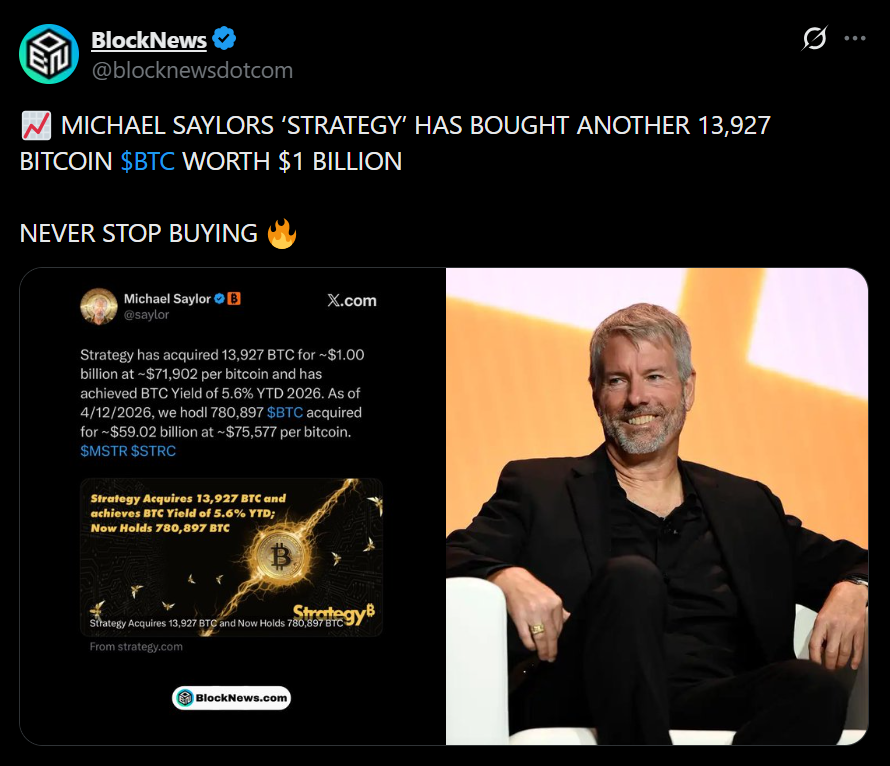 Strategy just added another massive chunk of Bitcoin, and this time the focus is pretty clear, accumulation at scale, regardless of short-term price. The company bought 13,927 BTC over the past week at an average price of around $71,902, spending roughly $1 billion in the process. It’s not a small dip-buy, it’s a statement, again.