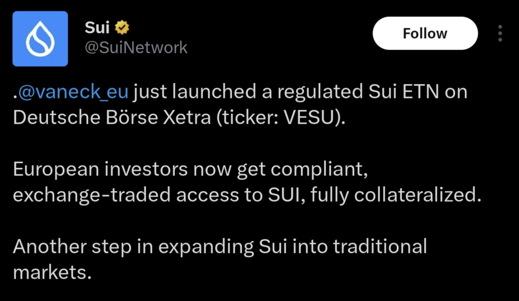 On the institutional front, SUI has quietly stacked wins. VanEck launched a regulated Sui ETN on Deutsche Börse Xetra under the ticker VESU, opening access to European investors through a fully collateralized exchange-traded product. That’s traditional finance meeting next-gen blockchain, and it matters.