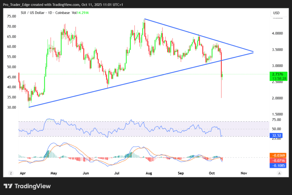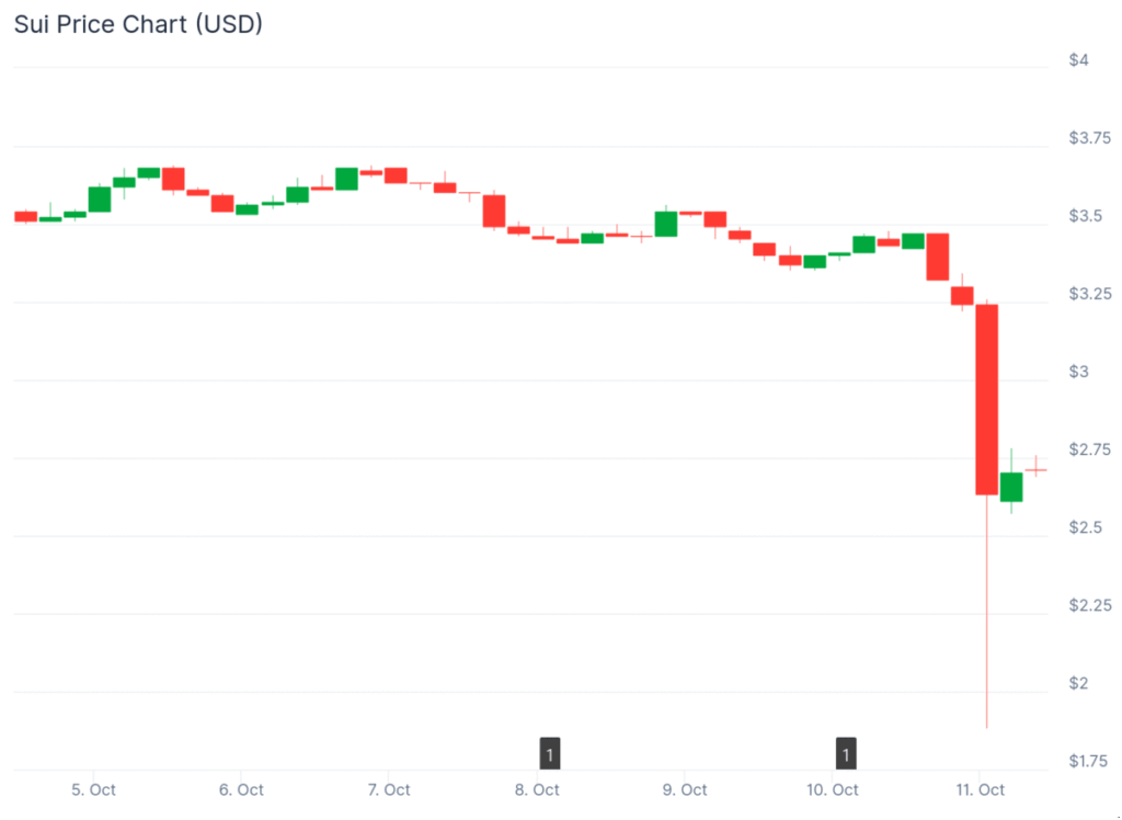 Sui managed to claw its way back from the $0.50 low to around $2.40, but it still closed the day down more than 20%. At the time of writing, SUI trades near $2.76, with a market cap of roughly $10 billion — down over $2.5 billion from just a day earlier.