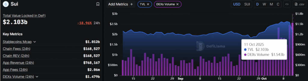 Digging deeper into the chain, things aren’t looking too great either. Data from DeFiLlama shows that SUI’s Total Value Locked (TVL) fell by nearly 19%, now sitting at around $2.1 billion.