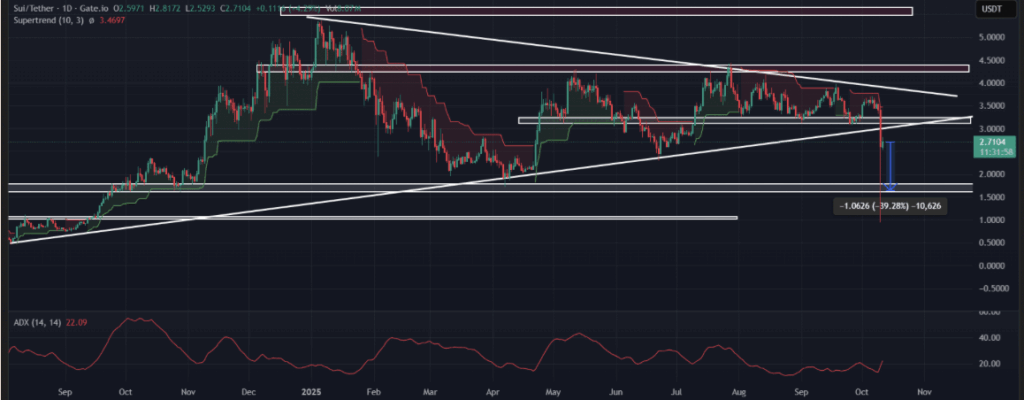 The daily chart shows SUI stuck in a tight range between $2.52 and $2.81. That’s basically no man’s land. If it can’t recover soon, analysts warn the next stop could be $1.65, marking another 40% slide from current levels.