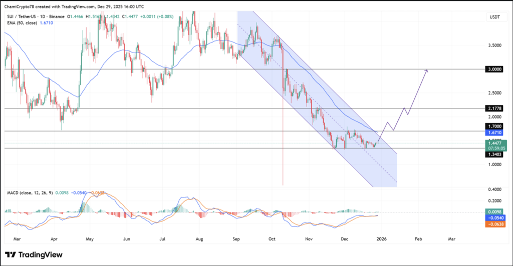 What stands out now is where price is sitting. Instead of rejecting sharply from the channel ceiling, SUI has stabilized near it. That keeps breakout conditions alive. If price can push through the descending channel, the next natural target sits near the 50 EMA around $1.67.