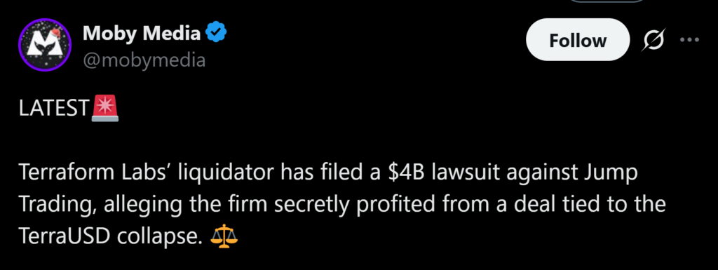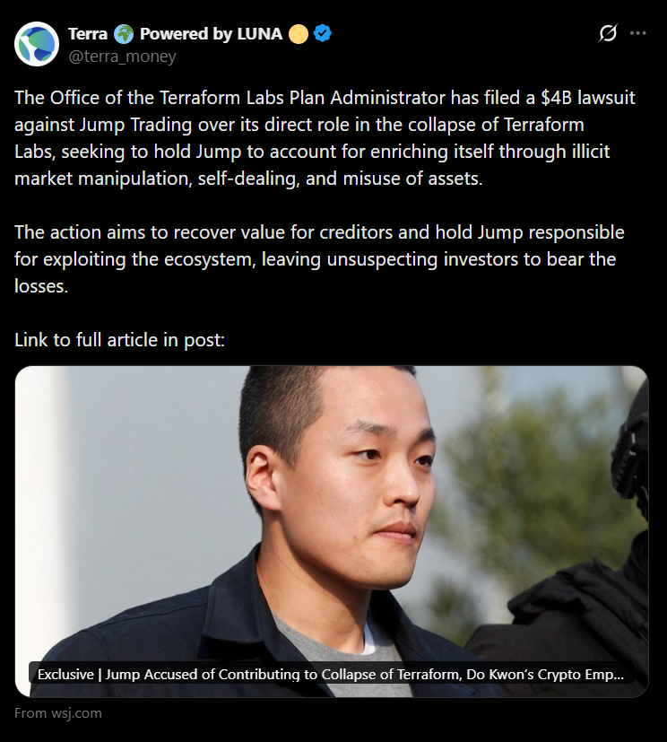 The court-appointed administrator overseeing the fallout from Terraform Labs’ collapse has filed a major lawsuit against Jump Trading, accusing the high-speed trading firm of profiting from — and contributing to — one of crypto’s largest failures. According to a Wall Street Journal report, the suit seeks $4 billion in damages and names Jump Trading, co-founder William DiSomma, and Kanav Kareiya, a former intern who later became the firm’s president. Terraform’s post-bankruptcy X account confirmed the filing on Friday.